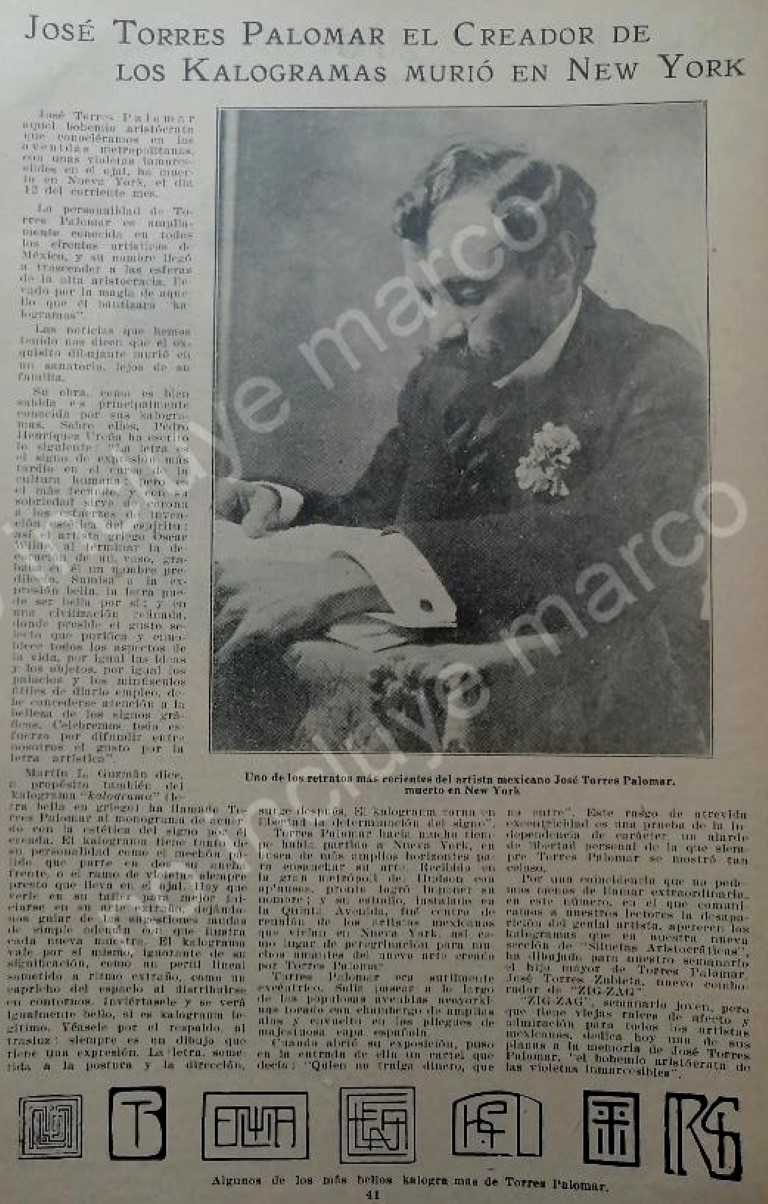 Que es lo que estamos ofreciendo !! Nota de prensa , afiche o grabado original de revistas o diarios de esa epoca. no es revista completa FICHA TECNICA. Famoso por ser quien invento el KALOGRAMA, una especia de monograma personalizado que hacia para Artistas y Famosos. .- Material: Papel .- Original: Si .- Hojas: 1 .- Medidas: 26 x 19 Cms +- .- Condiciones: Mire la imagen .- No incluye marco .- L.I. ZIGZG-2 .- No es una revista. .- Contiene otras notas .- Las hojas originales no tienen marcas ni leyendas de copy y similares Referencias: .- Historiografia antigua .- Notas de prensa antigua .- Recortes de periodicos Mexicanos .- Notas periodisticas antiguas .- Tienda de Historiografia antigua .- Alta sociedad Mexicana Porfiriana .- Afiches originales de la revolucion Mexicana