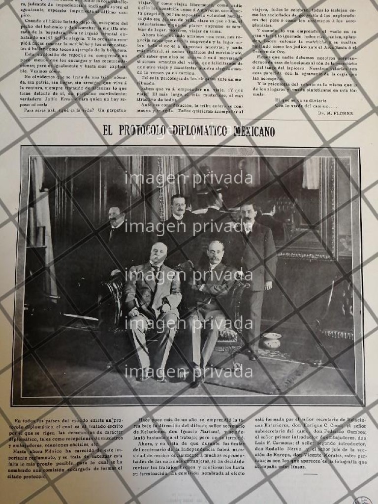 Hoja de prensa original rescatada de publicación de esa época. . FICHA TÉCNICA: L. De la Barra Enrique C. Creel Limantour. Ramon Corral. Federico Gamboa. . .- Material: Papel .- Original: Si .- Hojas: 1 .- Medidas: 33 x 26 Cms +- .- Condiciones: Mire la imagen .- No incluye marco .- L.I. ELMDOILS-1910-T2 .- No es una revista. .- Contiene otras notas ajenas a la imagen en cuestion. .- Las hojas originales no tienen marcas de cuadricula ni leyendas. . Referencias: .- Historiografia antigua .- Notas de prensa antigua .- Recortes de periódicos Mexicanos .- Notas periodísticas antiguas .- Tienda de Historiografia antigua .- notas antiguas de la Alta sociedad Mexicana .- Afiches retro de México