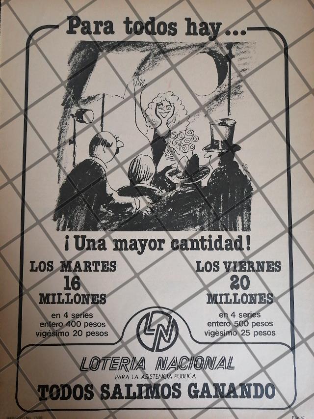 Que es lo que estamos ofreciendo !! Cartel o afiche publicitario original de esa epoca. FICHA TECNICA: .- Material: Papel .- Original: Si .- Hojas: 1 .- Medidas: 35 x 25 Cms +- .- Condiciones: Mire la imagen .- No incluye marco .- L.I. LT-078 .- No es una revista. .- Contiene otras notas .- Las hojas originales no tienen marcas de cuadricula ni leyendas Referencias: .- Publicidad antigua de la loteria nacional .- Publicidad retro Mexicana .- Recortes de periodicos Mexicanos .- Periodicos antiguos Mexicanos .- Carteles publicitarios vintage