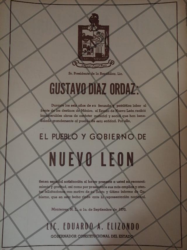 AFICHE POLITICO RETRO NUEVO LEON FELICITA A DIAZ ORDAZ 1970