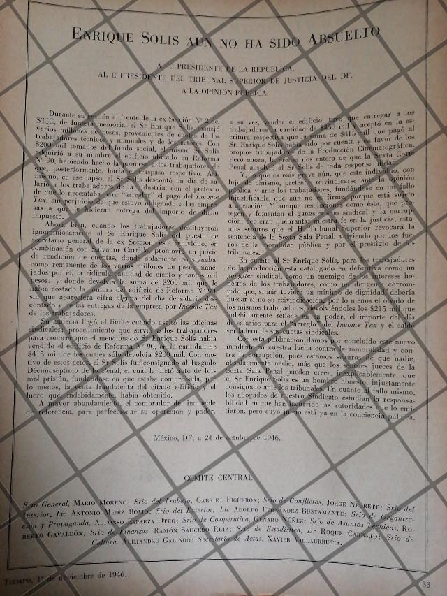 Que es lo que estamos ofreciendo !! Hoja de prensa original rescatada de publicación de esa época. FICHA TÉCNICA: Sindicato de trabajadores de la Industria Cinematografica por el caso de Enrique Solis. de desvio de fondos. Politicos Politica .- Material: Papel .- Original: Si .- Hojas: 1 .- Medidas: 27 X 20 Cms +- .- Condiciones: Mire la imagen .- No incluye marco .- L.I. TMPO-01 .- No es una revista. .- Contiene otras notas .- Las hojas originales no tienen marcas de cuadricula ni leyendas Referencias: .- Historiografia antigua .- Notas de prensa antigua .- Recortes de periódicos Mexicanos .- Notas periodísticas antiguas .- Tienda de Historiografia antigua .- notas antiguas de la Alta sociedad Mexicana .- Afiches retro de México