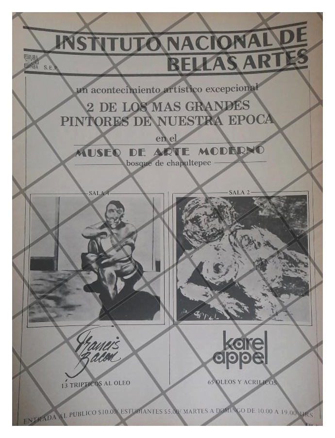 Que es lo que estamos ofreciendo !! Afiche publicitario antiguo original . FICHA TECNICA: 1979 INBA INSTITUTO NAIONAL DE BELLAS ARTES Francis Bacon Museos . .- Material: Papel .- Original: Si .- Hojas: 1 .- Medidas: 36 X 25 Cms +- .- Condiciones: Mire la imagen .- No incluye marco .- L.I. LT-89 .- No es una revista. .- Contiene otras notas ajenas a la imagen en cuestion. .- Las hojas originales no tienen marcas de cuadricula ni leyendas. . NOTAS: . Publicidad de Gobierno Publicidades retro de Gobierno Publicidades vintage Tienda de publicidad antigua Afiches retro de Gonierno