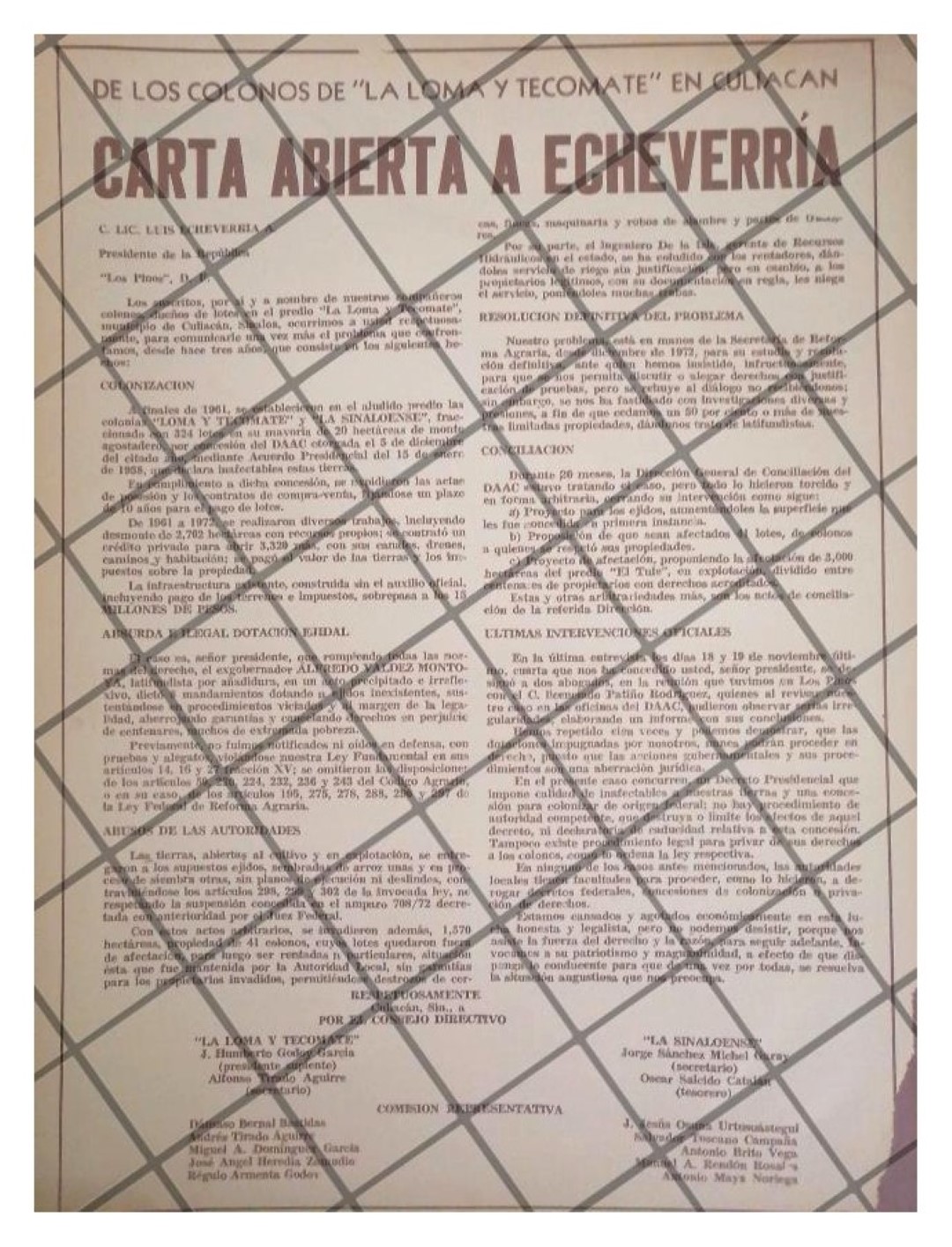 AFICHE RETRO. CARTA DE COLONIA TECOMATE A LUIS ECHEVERRIA 1973
