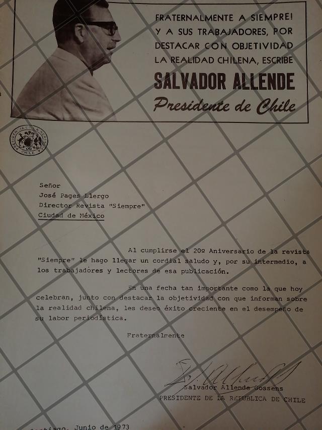 AFICHE RETRO ORIGINAL. CARTA DE SALVADOR ALLENDE A JOSE PAGES LLERGO 1973
