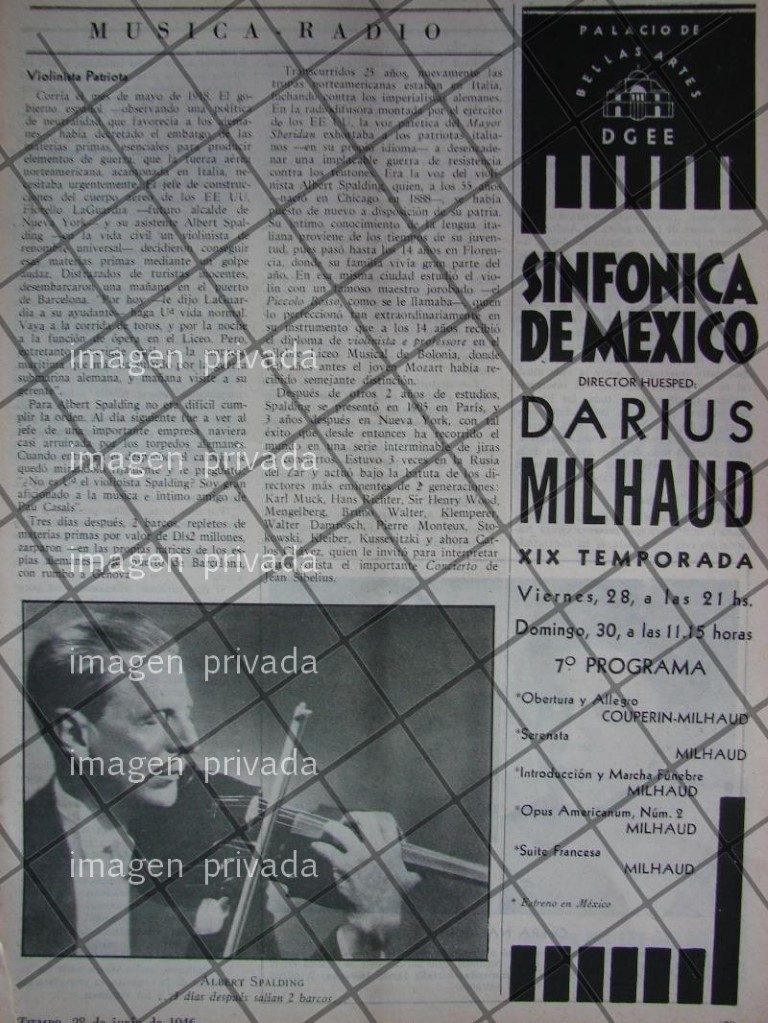 Que es lo que estamos ofreciendo !! Hoja de prensa original rescatada de publicación de esa época. FICHA TÉCNICA: Musicos Compositores Orquesta Sinfonica Nacional de Mexico Albert Spalding .- Material: Papel .- Epoca: 1946 .- Original: Si .- Hojas: 1 .- Medidas: 27 X 21 Cms +- .- Condiciones: Mire la imagen .- No incluye marco .- L.I. TMPO-01 .- No es una revista. .- Contiene otras notas .- Las hojas originales no tienen marcas de cuadricula ni leyendas Referencias: .- Historiografia antigua .- Notas de prensa antigua .- Recortes de periódicos Mexicanos .- Notas periodísticas antiguas .- Tienda de Historiografia antigua .- notas antiguas de la Alta sociedad Mexicana .- Afiches retro de México