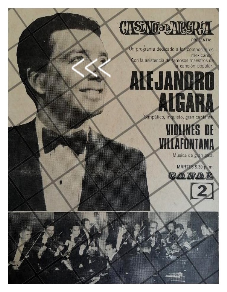 Que es lo que estamos ofreciendo !! Hoja de prensa original rescatada de publicación de esa época. . FICHA TECNICA. Cantantes. Alejandro Algara . Estaciones de Television Televisa Televisoras Programas de Television retro Telesistema Mexicano . .- Material: Papel .- Original: Si .- Hojas: 1 .- Medidas: 22 x 19 Cms +- .- Condiciones: Mire la imagen .- No incluye marco .- L.I. OTROS-04 .- No es periodico completo. .- Contiene otras notas .- Las hojas originales no tienen marcas de cuadricula ni leyendas . Referencias: .- Historiografia antigua .- Notas de prensa antigua .- Recortes de periódicos Mexicanos .- Notas periodísticas antiguas .- Tienda de Historiografia antigua .- notas antiguas de la Alta sociedad Mexicana .- Afiches retro de México