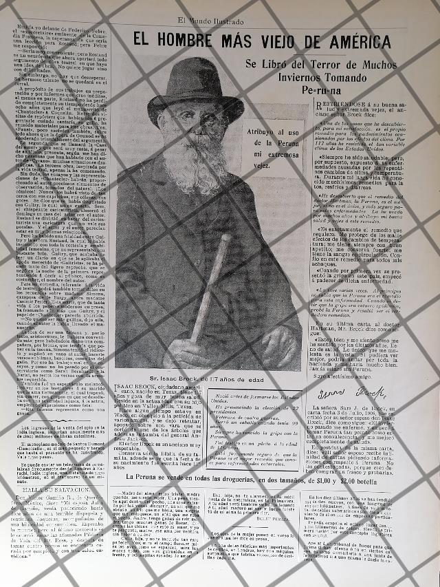 Que es lo que estamos ofreciendo !! Hoja de prensa original rescatada de publicación de esa época. . FICHA TÉCNICA: 1910 Para ese año era el hombre mas viejo del mundo en Wikipedia aparece que vivio hasta los 122 pero en esta publicidad de 1910 aparece de 117 un error en aquella Wikipagina . FICHA TECNICA .- Material: Papel .- Original: Si .- Hojas: 1 .- Medidas: 33 x 26 Cms +- .- Condiciones: Mire la imagen .- No incluye marco .- L.I. ELMDOILS-1910-T2-PAST.ROJ .- No es una revista. .- Contiene otras notas .- Las hojas originales no tienen marcas de cuadricula ni leyendas . Referencias: . .- Carteles de Publicidad antigua Mexicana .- Publicidad retro Mexicana .- Recortes de periodicos Mexicanos .- Periodicos antiguos Mexicanos .- Mexico antiguo. .- Carteles de publicidad vintage originales .- Historia de las empresas Mexicanas