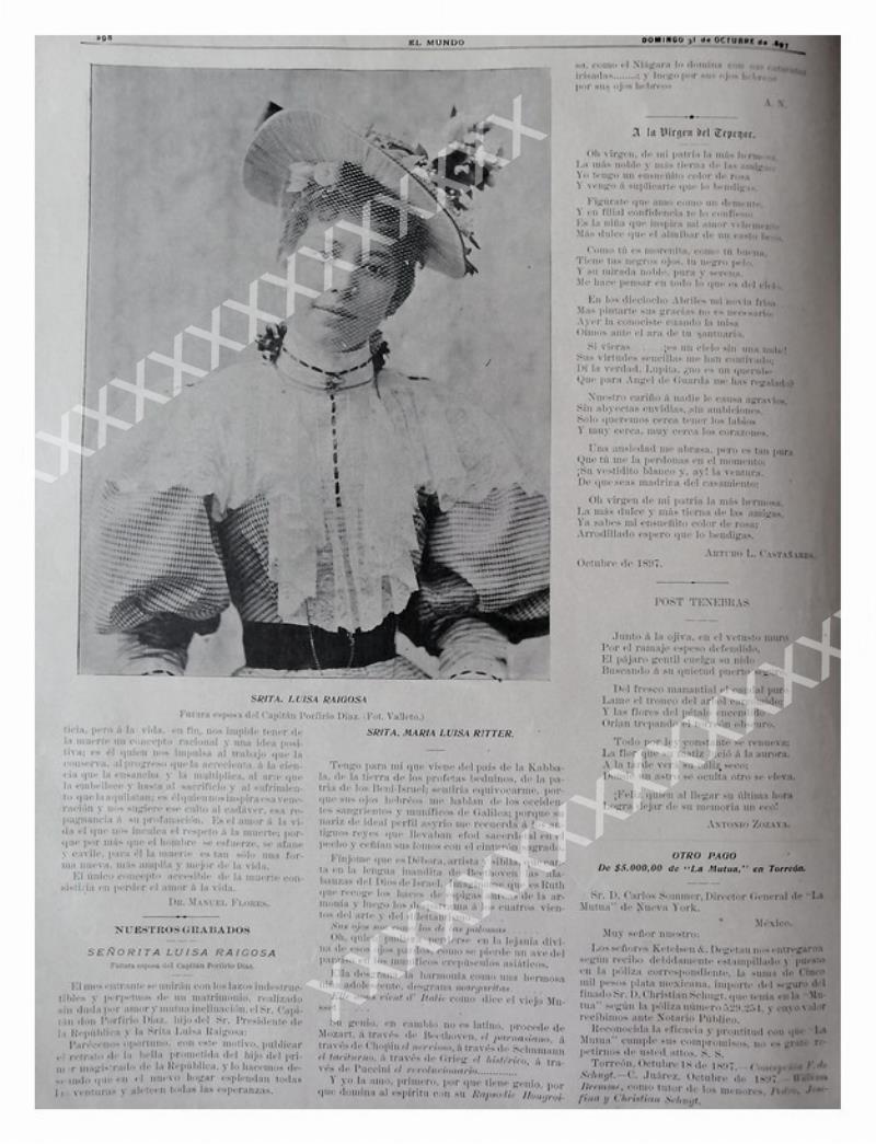 Que es lo que estamos ofreciendo !Nota de prensa , afiche o grabado original de esa epoca.En el momento de esa nota, era la prometicadel Hijo de Don. Porfirio Diaz.FICHA TECNICA:.- Material: Papel.- Original: .- Hojas: 1.- Medidas: 38 x 27 Cms.- Condiciones: Mire la imagen.- No incluye marco.- L.I. ELMNDIL-1897-L10.- No es una revista.- Contiene otras notasReferencias:.- Historiografia antigua.- Notas de prensa antigua.- Recortes de periodicos Mexicanos.- Notas periodisticas antiguas.- Tienda de Historiografia antigua