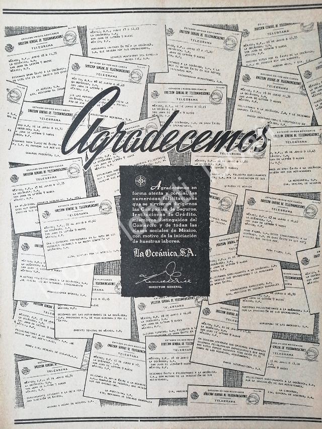 Aqui esta aseguradora agradece a otrasinstituciones sus felicitaciones y buenos deseos, rubricado por el entonces DirectorKenneth Price, esta aseguradora no eraotra cosa de Looyd de Londres, por esotantos alagos.Rumores posteriores dicen que estaaseguradora en realidad era una avanzadapara el espionaje del servicio deinteligencia Britanico, cosa que dejamosen el terreno de la especulacion.FICHA TECNICA:.- Material: Papel, Original.- Medidas: 28 X 20 Cms +-.- Condiciones: Mire la imagen.- No incluye marco.- L.I. EMPRESAS-003.- No es una revistaNOTAS:.- Bancos de Mexico.- Historia de la banca Mexicana.- Carteles de bancos Mexicanos.- Publicidad antigua de bancos.- Tienda de afiches antiguos