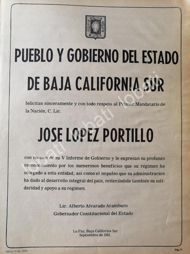 CARTEL ANTIGUO ORIGINAL DE BAJA CALIFORNIA SUR FELICITA A JOSE LOPEZ PORTILLO 1981 /66