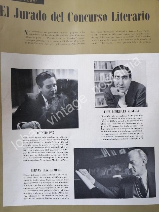 El » Premio LIFE en Español » fue una competencialetararia que organizo la revista LIFE en AmericaLatina en 1960, en la cual quedo ganadora la novela» Ceremoniia Secreta » del Marco Denevi, de esto despues se creo una compilacion en libro..Las publicidades de este concurso son hoy en diaextremadamente raras y dificiles de encontraraqui en esta se presenta el jurado de ese premioentre ellos Octavio Paz.FICHA TECNICA:.- Material: Papel, Original.- Medidas: 33 x 25 Cms.- Hojas: 2.- Condiciones: Mire la imagen..- No incluye marco.- L.I. OTROS-001NOTAS:Nota de prensa antiguas, no es unarevista completa