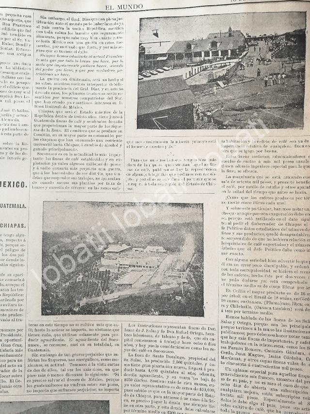 Esta fue un conflicto Fronterizo enel que intervino directamente PorfirioDiaz y que pudo haber desencadenado uuna Guerra y de la cual se habla muy poco., le primera pagina habla de loshechos, la segunda contiene otras notasde esa epoca pero imagenes de las fincasy territorios en disputaFICHA TECNICA:.- Material: Papel.- Original.- Medidas: 36 x 27 Cms.- 2 Hojas.- Condiciones: Mire la imagen.- No incluye marco.- L.I. ELMNDOILST-L5/1894-95.- No es una revistaNOTAS:Referencias:.- Historiografia Mexicana antigua.- Notas de prensa antigua.- Recortes de periodicos Mexicanos.- Periodicos antiguos Mexicanos.- Mexico antiguo