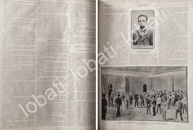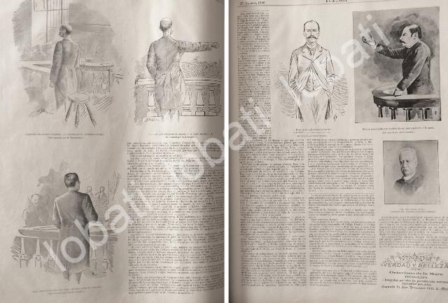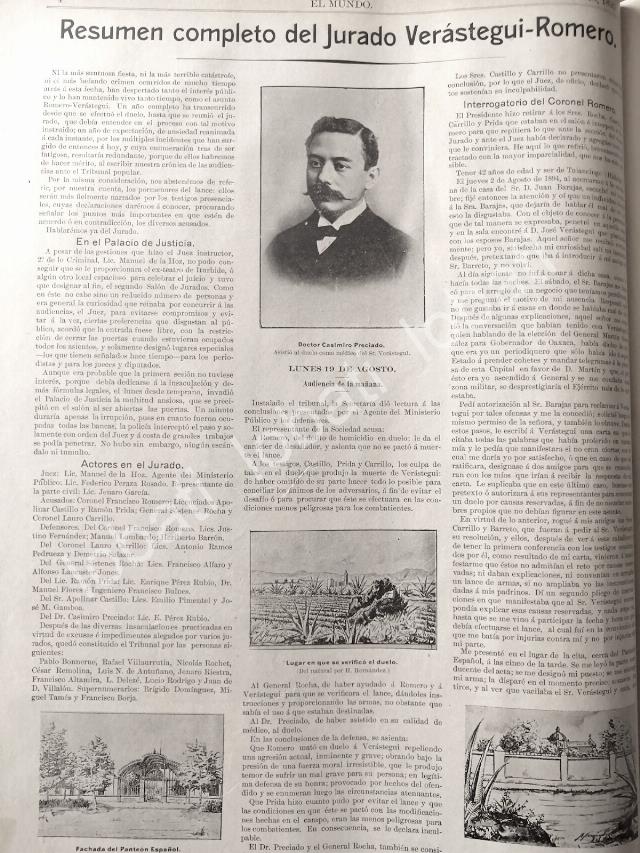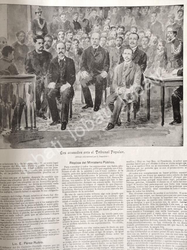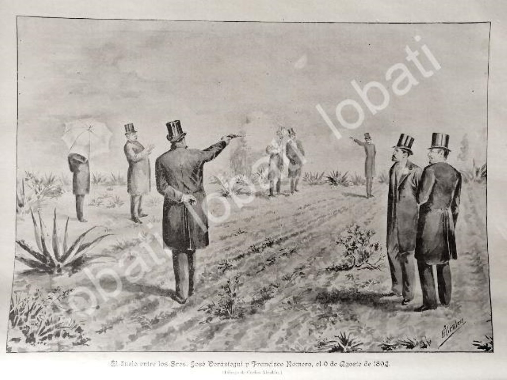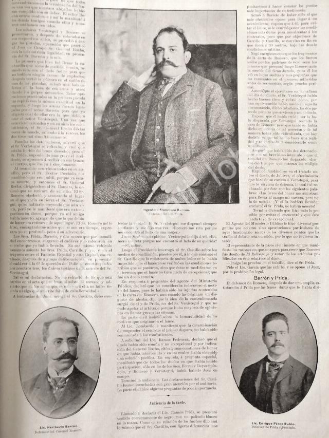NOTA DE PRENSA ANTIGUA ORIGINAL.Aqui un reportaje completo de Agosto de 1895 con todo sobre aquel legendarioDuelo entre EL Coronel. Franciso Romeroy el Sr. Jose Verastegui, donde murioeste utlimo, en este reportaje se registrotodo el proceso legal, testigos, medicosforense, etc y aparecen grandes personajesde la epoca.Un articulo historico y de coleccion no solo por esos eventos, sino por que tienegrabados al natural de grandes Artistascomo Carlos Alcalde, Leandro Izaguirre yGilberto Iriarte.FICHA TECNICA:.- Material: Papel.- Original.- Medidas: 36 X 27 Cms C/U.- 8 Hojas.- Condiciones: Mire la imagen.- No incluye marco.- L.I. ELMNDOILST/1895/T2.- No es una revistaNOTAS:.- Historiografia Mexicana antigua.- Noticias antiguas Mexicanas.- Notas de prensa antiguas.- Periodicos antiguos Mexicanos.- Epoca porfiriana