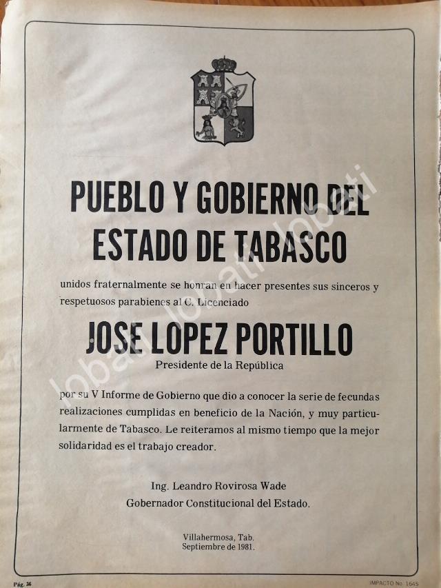 CARTEL ANTIGUO ORIGINAL DE GOBIERNO DE TABASCO FELICITA A JOSE LOPEZ PORTILLO 1981 /67
