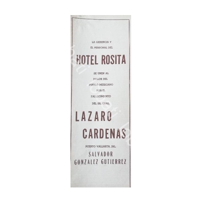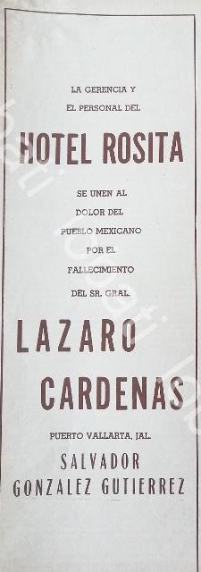 CARTEL ANTIGUO ORIGINAL DE HOTEL ROSITA, PUERTO VALLARTA, PESAME POR MUERTE DE LAZARO CARDENAS, 1970 /598