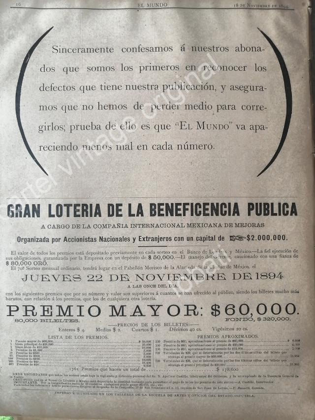 CARTEL ANTIGUO ORIGINAL DE LOTERIA NACIONAL 1894 Y SEGUROS LA MEXICANA