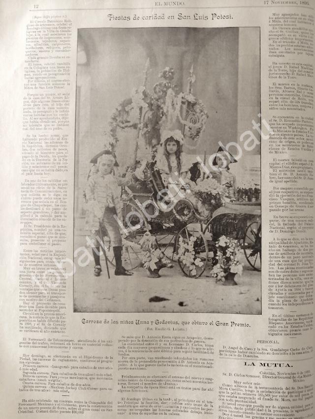 Hijos de Jorge Unna y otros, de lasfamilias mas Acaudaladas de San LuisPotosi, entre otros famosos por lasmueblerias de alta gama Jorge UnnaNOTA DE PRENSA ANTIGUA ORIGINAL.FICHA TECNICA:.- Material: Papel.- Original.- Medidas: 36 X 27 Cms C/U.- 1 Hojas.- Condiciones: Mire la imagen.- No incluye marco.- L.I. ELMNDOILST/1895/T2.- No es una revistaNOTAS:.- Historiografia Mexicana antigua.- Noticias antiguas Mexicanas.- Notas de prensa antiguas.- Periodicos antiguos Mexicanos.- Epoca porfiriana