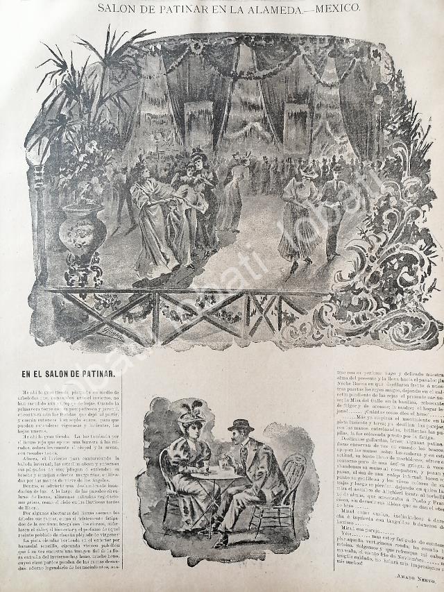 Un grabado digno de enmarcar, ya que fue sino el primero, el segundo patinaderode la Ciudad de Mexico, pero mas valiosoaun por ser dibujado por Carlos Alcaldeun rematar con un poema inedito del granAmado Nervo.FICHA TECNICA:.- Material: Papel.- Original.- Medidas: 36 x 27 Cms.- 1 Hojas.- Condiciones: Mire la imagen.- No incluye marco.- L.I. ELMNDOILST-L5/1894-95.- No es una revistaNOTAS:Referencias:.- Historiografia Mexicana antigua.- Notas de prensa antigua.- Recortes de periodicos Mexicanos.- Periodicos antiguos Mexicanos.- Mexico antiguo