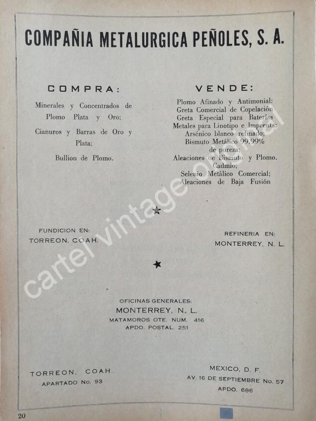 CARTEL ANTIGUO ORIGINAL DE PEÑOLES S.A CIA. METALURGICA 1942