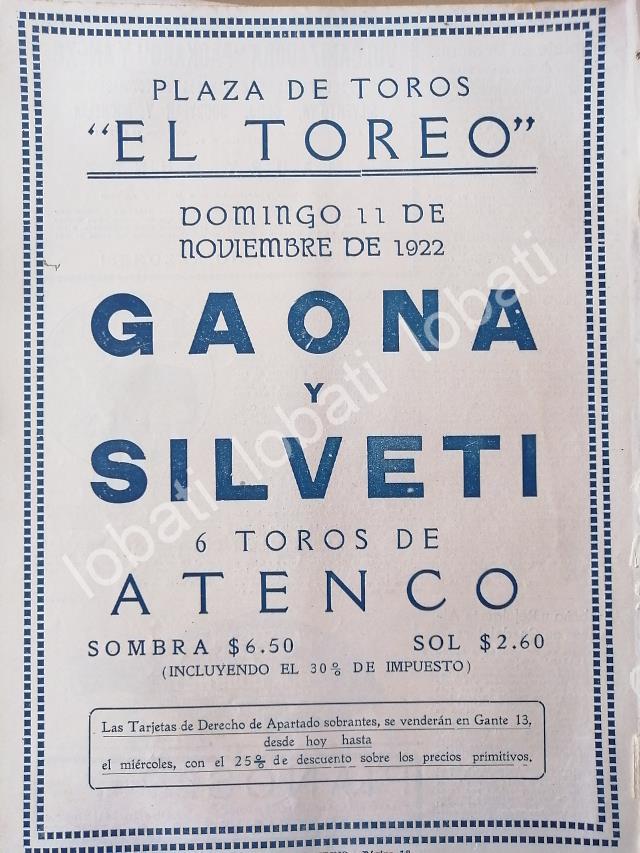 CARTEL ANTIGUO ORIGINAL DE PLAZA DE TOROS EL TOREO, 1922 GAONA Y SILVETI /53