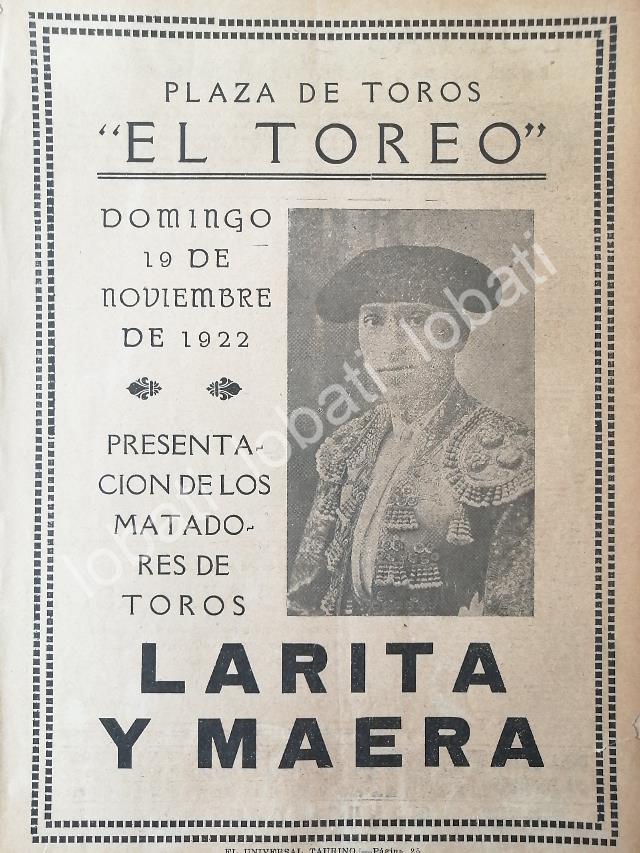 CARTEL ANTIGUO ORIGINAL DE PLAZA DE TOROS EL TOREO, 1922 LARITA Y MAERA, /52