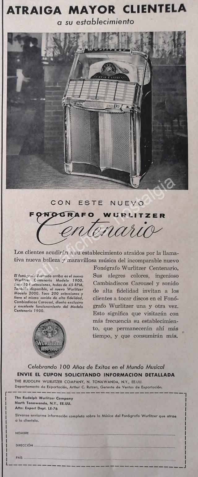 CARTEL ANTIGUO ORIGINAL DE ROCKOLAS WURLITZER CENTENARIO 100 ANIVERSARIO 1956 / MUY RARO