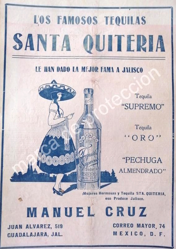 CARTEL ANTIGUO ORIGINAL DE TEQUILA SANTA QUITERIA DE MANUEL CRUZ 1922 RARO