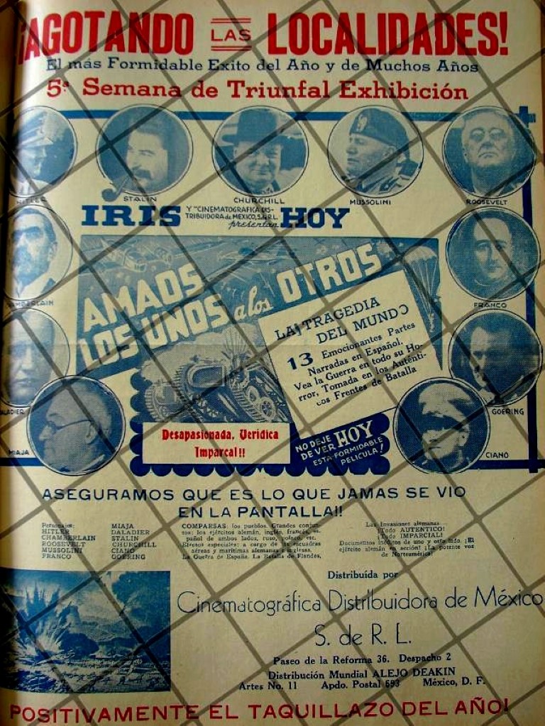 Que es lo que estamos ofreciendo !! Afiche publicitario antiguo original esa epoca. no es revista completa, no es loby card. FICHA TECNICA: Este fue un documental a manera de noticiero que se exhibio de cines de toda la Republica que narraba en tiempo casi real los hechos de la Segunda Guerra mundial en curso, una de las primeras de su tipo en el mundo, en Mexico se le dio el nombre de AMAOS LOS UNOS A LOS OTROS y cada pais le dio el nombres diferentes. En Mexico era distribuida en Exclusiva por Cinematrografica Distribuidora de Mexico S de R.L y fue un exito arrollador por la drudeza de los hechos ineditos hasta esas fechas. .- Material: Papel .- Epoca: 1941 .- Original .- Medidas: 38 x 27 Cms .- Condiciones: Mire la imagen .- No incluye marco .- L.I. ELCGR-001 .- No es un Loby card .- No es una pelicula, es cartel .- Contiene otras notas al reverso NOTAS: Publicidad de empresas Mexicanas Publicidades retro de cine Mexicano Publicidades vintage Tienda de publicidad antigua Publicidad antigua de Cine Carteles antiguos de Cine originales.