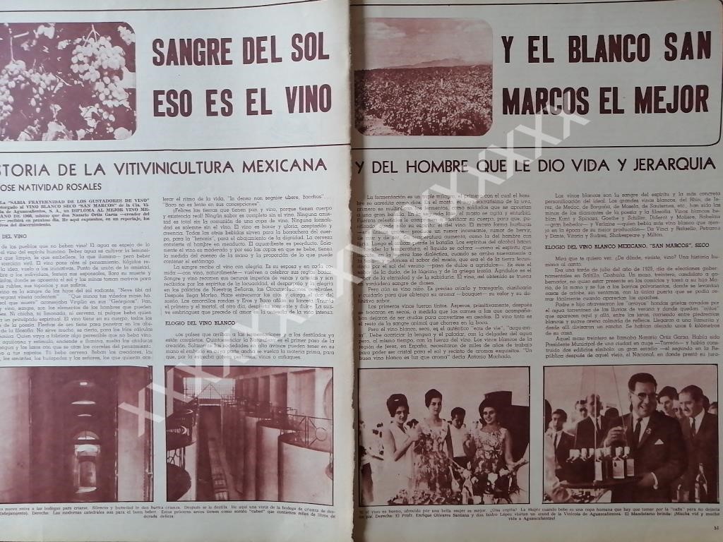 Que es lo que estamos ofreciendo !…Nota de prensa , afiche o grabadooriginal de esa epoca.FICHA TECNICA:Reporjae amplio de una de las mas famosascasas vitivinicolas de Mexico desde los años 60s, Casa San Marcos..- Material: Papel.- Original:.- Hojas: 3.- Medidas: 36 x 24 Cms +-.- Condiciones: Mire la imagen.- No incluye marco.- L.I. LBRP-002.- No es una revista.- Contiene otras notasReferencias:.- Historiografia antigua.- Notas de prensa antigua.- Recortes de periodicos Mexicanos.- Notas periodisticas antiguas.- Tienda de Historiografia antigua