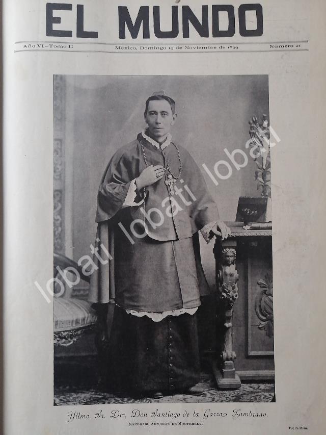 Por el nombramiento como Arzobispode Monterrey, de una de las familiasmas acaudaladas y con mas abolengo de esa Ciudad., imagen de uno de losmas grandes Fotografos, Octaviano de la Mora.FICHA TECNICA:.- Material: Papel.- 1 Hojas.- Original.- Medidas: 36 X 27 Cms +-.- Condiciones: Mire la imagen.- No incluye marco.- L.I. ELMNDOILST/L9/1899-T2.- No es una revista NOTAS:.- Portadas antiguas originales.- Portadas historicas.- Portadas del siglo 19.- Arte antiguo.- Antique Mexican Covers