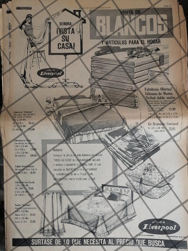 Que es lo que estamos ofreciendo !! Afiche publicitario antiguo original . FICHA TECNICA. Tiendas . .- Material: Papel .- Original: Si .- Hojas: 1 .- Medidas: 56 X 35 Cms +- .- Condiciones: Mire la imagen .- No incluye marco .- L.I. LT83 -PER .- No es periodico completo. .- Contiene otras notas ajenas a la imagen en cuestion. .- Las hojas originales no tienen marcas de cuadricula ni leyendas. . REFERENCIAS: Publicidad de empresas Mexicanas Publicidades retro Publicidades vintage Tienda de publicidad antigua