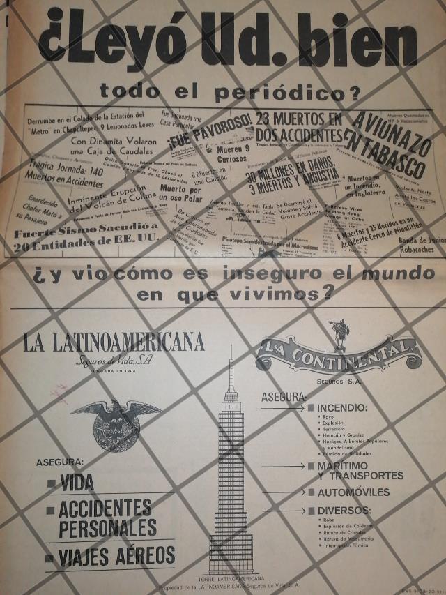 Que es lo que estamos ofreciendo !! cartel publicitario antiguo original . FICHA TECNICA. AÑO. Aseguradoras . .- Material: Papel .- Original: Si .- Hojas: 1 .- Medidas: 50 x 35 Cms +- .- Condiciones: Mire la imagen .- No incluye marco .- L.I. P1024-001 .- No es periodico completo. .- Contiene otras notas .- Las hojas originales no tienen marcas de cuadricula ni leyendas . Referencias: .- Carteles de Publicidad antigua Mexicana .- Publicidad retro Mexicana .- Recortes de periodicos Mexicanos .- Periodicos antiguos Mexicanos .- Mexico antiguo. .- Carteles de publicidad vintage originales .- Historia de las empresas Mexicanas