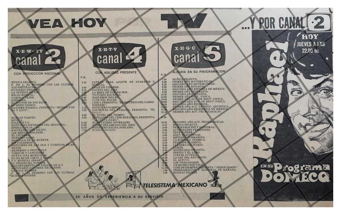 Que es lo que estamos ofreciendo !! Hoja de prensa original rescatada de publicación de esa época. . FICHA TECNICA. . Estaciones de Television Televisa Televisoras Programas de Television retro Cantante Rafael . .- Material: Papel .- Original: Si .- Hojas: 1 .- Medidas: 21 X 35 Cms +- .- Condiciones: Mire la imagen .- No incluye marco .- L.I. OTROS-04 .- No es periodico completo. .- Contiene otras notas .- Las hojas originales no tienen marcas de cuadricula ni leyendas . Referencias: .- Historiografia antigua .- Notas de prensa antigua .- Recortes de periódicos Mexicanos .- Notas periodísticas antiguas .- Tienda de Historiografia antigua .- notas antiguas de la Alta sociedad Mexicana .- Afiches retro de México